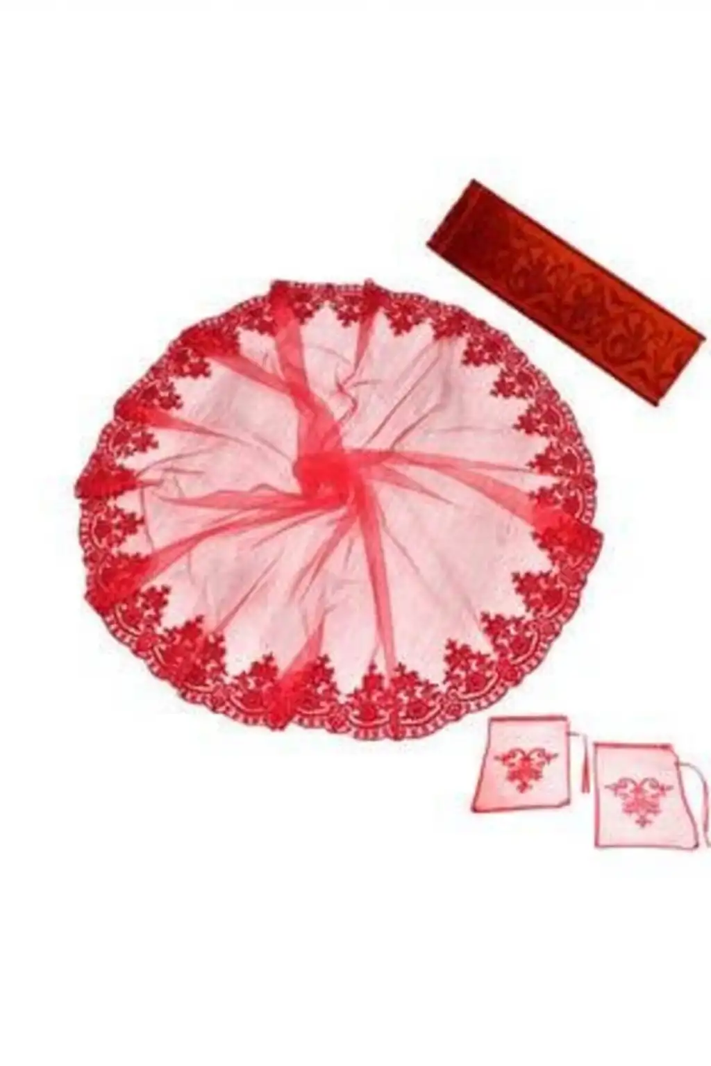 Kına Örtüsü Kırmızı Güpürlü Gelin Duvak Kuşak Eldiven El Gülü Set Gelin Örtü Kına Seti